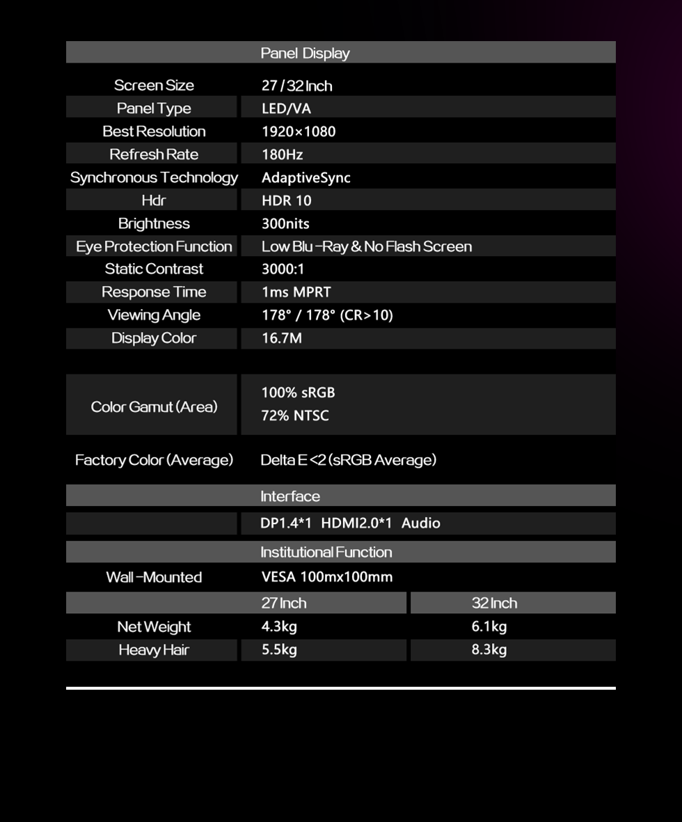 Accessories: DP Cable *1, Metal Stand&Screw, Screw Driver, Instruction Manual, Warranty Card, Wall Bracket