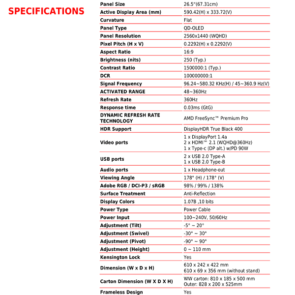 Visualize your victory with the MPG 271QRX QD-OLED gaming monitor. It boasts a 2560x1440 (WQHD) next-gen QD-OLED panel, 360Hz refresh rate, and rapid 0.03ms(GtG) response time. VESA certification for ClearMR 13000 and DisplayHDR True Black 400 ensures exceptionally vivid images and mitigates motion blur. OLED Care 2.0 reduces OLED burn-in risks. For console gamers, the MPG 271QRX QD-OLED provide HDMI 2.1 ports with 48Gbps bandwidth, 120Hz support, VRR, and ALLM.