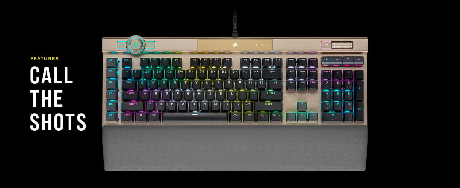 You’ve Reached the Top:The CORSAIR K100 RGB is the pinnacle of CORSAIR keyboards, offering the cutting-edge performance, style, durability, and customization that gamers need to stand above the rest     The Centerpiece of Your Setup:The CORSAIR K100 RGB boasts a refined design bolstered by a durable aluminum frame, dynamic per-key RGB backlighting, and a 44-zone three-sided LightEdge     Midnight Gold Style: Timeless design with a gold-anodized aluminum frame and accents on the macro, arrow, and media keys creates a classic dual-tonestyle     Powered by CORSAIR AXON Hyper-Processing Technology:CORSAIR’s most advanced gaming keyboard experience delivers up to 8x faster throughput with native 8,000Hz hyper-polling and 4,000Hz key scanning, while simultaneously driving up to 20-layer lighting effects     Exclusive CORSAIR OPX RGB Optical-Mechanical Keyswitches: Hyper-fast input with 1.0mm actuation distance, smooth linear travel, and guaranteed for 150 million keystrokes