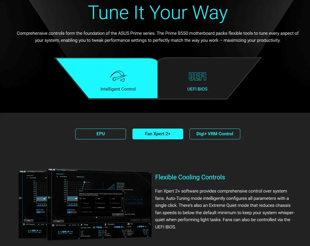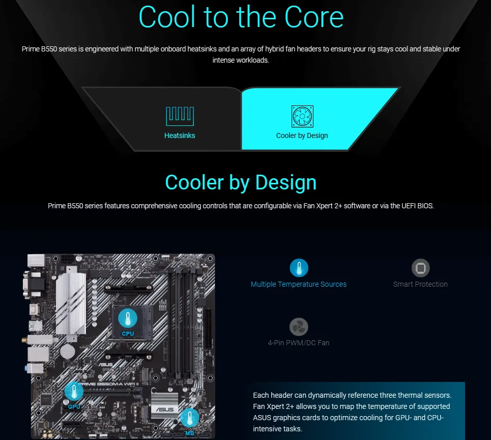 â– Comprehensive Cooling: VRM heatsink, PCH heatsink, hybrid fan headers, and Fan Xpert 2+ utility
