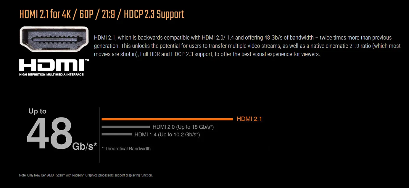 - 1 x HDMI port, supporting a maximum resolution of 4096x2160@60 Hz * Support for HDMI 2.1 version, HDCP 2.3, and HDR.
