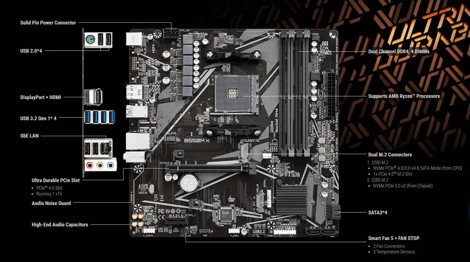 AMD B550 Ultra Durable Motherboard with Digital VRM Solution, PCIe 4.0 x16 Slot, Dual PCIe 4.0/3.0 M.2 Connectors, GbE LAN, Smart Fan 5 with FAN STOP