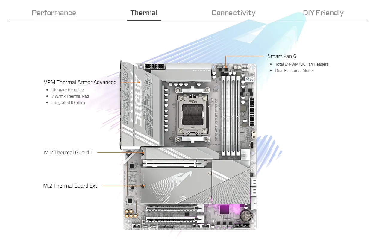 • Efficient Thermal:VRM Thermal Armor Advanced & M.2 Thermal Guard L