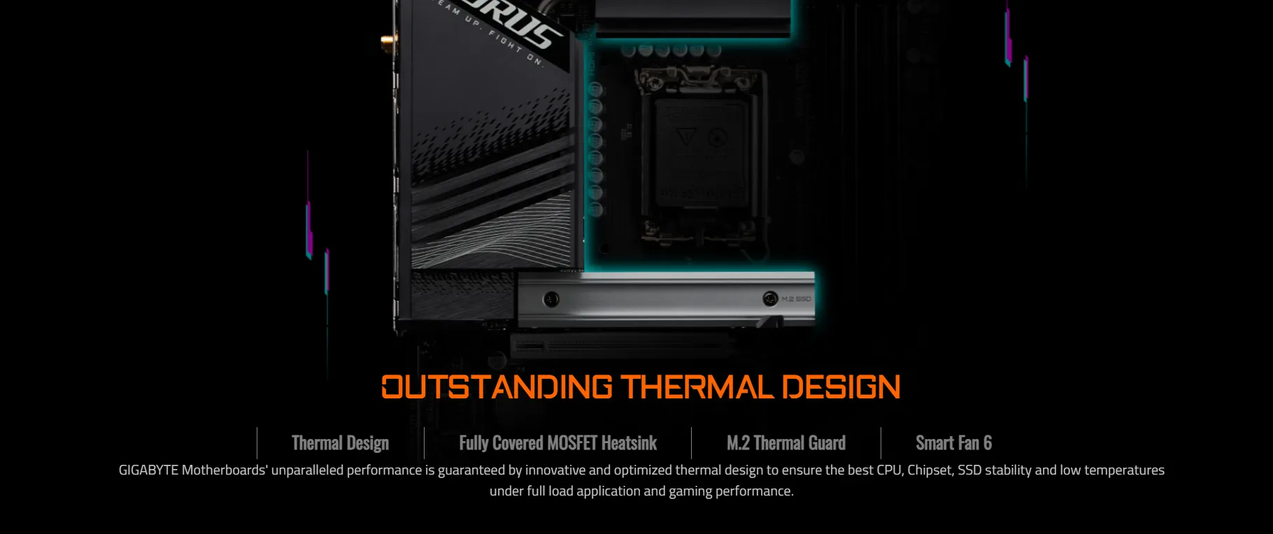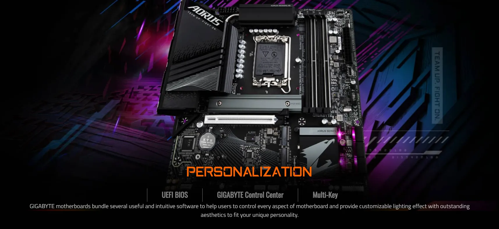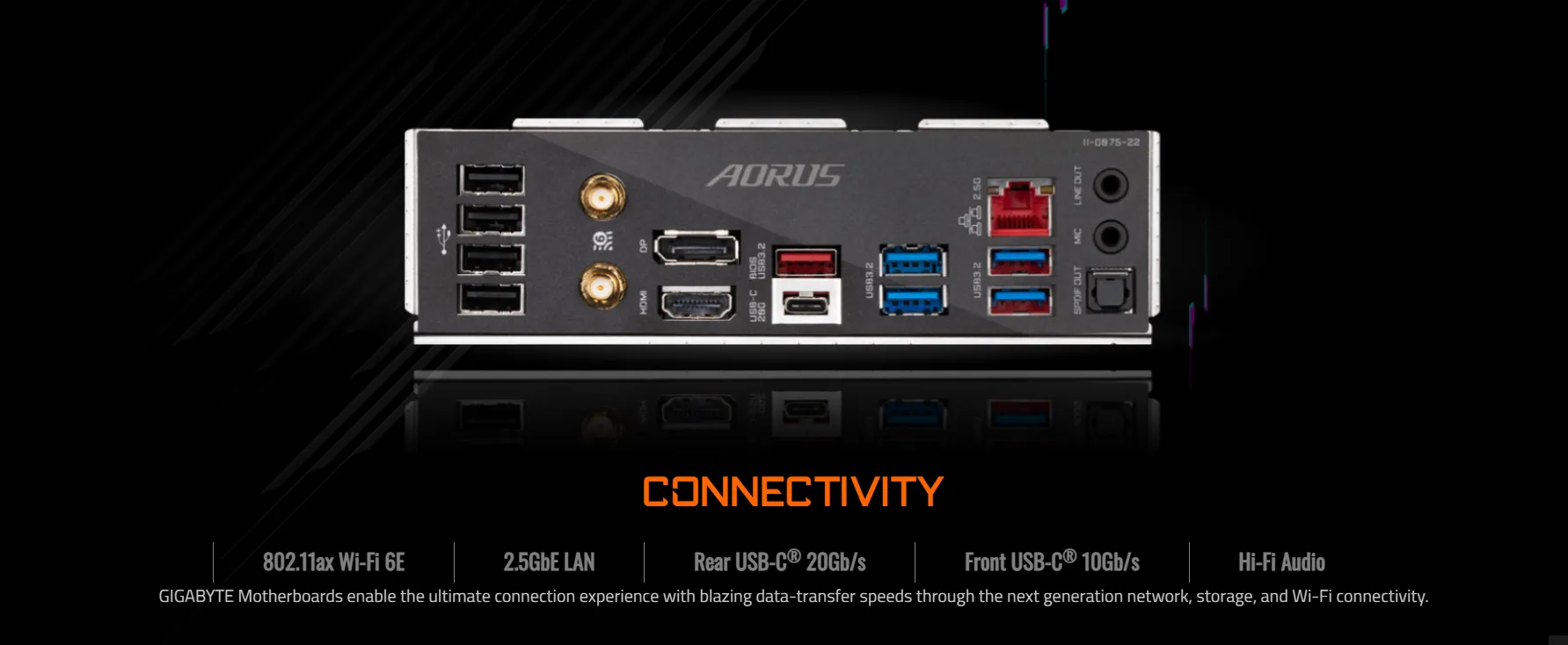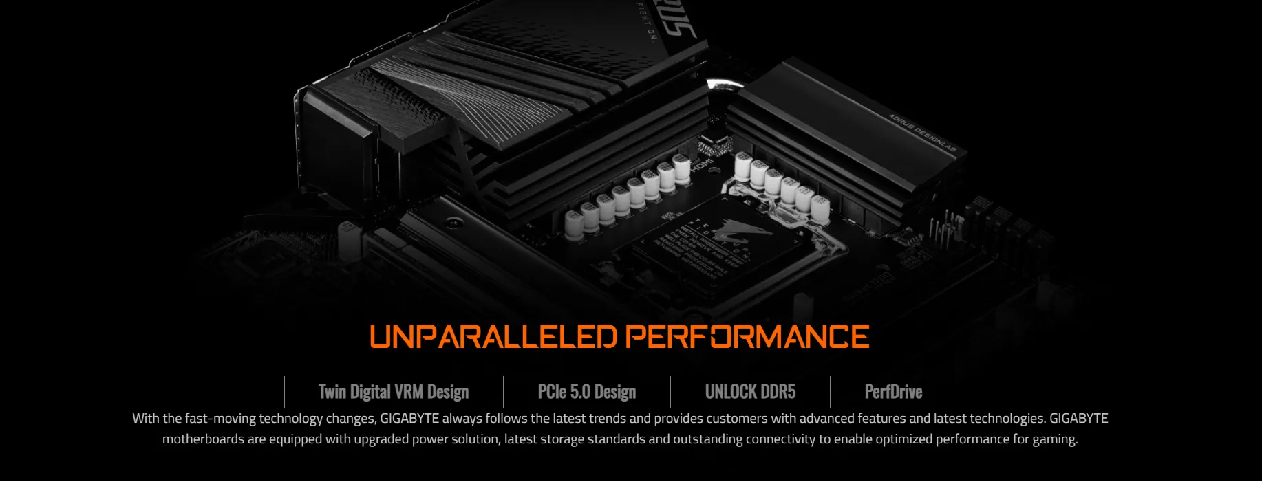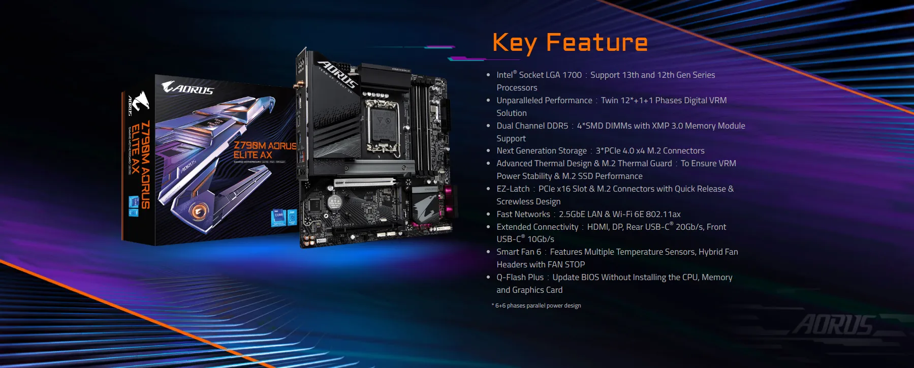 Intel LGA 1700 Socket: Supports 13th and 12th Gen Intel Core Series Processors DDR5 Compatible: 4*SMD DIMMs with XMP 3.0 Memory Module Support Commanding Power Design: Twin 16+1+2 Phases Digital VRM Solution with 70A Power Stage Cutting-Edge Thermal Design: M.2 Thermal Guard III, Fully Covered MOSFET Heatsinks, PCIe Ultra Durable Armor, 6-Layer PCB Next Gen Connectivity: SMD PCIe 5.0, 4* PCIe 4.0 x4 M.2, USB 3.2 Gen 2x2 Type-C EZ-Latch: PCIe 5.0 EZ-Latch with a Quick Release & Screwless Design Fast Networking: 2.5GbE LAN, Intel WiFi 6E 802.11ax, 2T2R & BT5 with AORUS Antenna Dynamic Audio: High-End Audio Capacitor, Audiophile WIMA Capacitors Fine Tuning Features: RGB FUSION 2.0, Supports Addressable LED & RGB LED Strips, Smart Fan 6, Q-Flash Plus Update BIOS without installing CPU, Memory, and GPU. Ascend the Throne of Gaming with the Z790 AORUS ELITE AX. The Z790 AORUS ELITE AX supports 13th and 12th Gen Intel Core Processors unparalleled performance. Unlock your gaming potential with GIGABYTE Z790 Motherboards. GIGABYTE Z790 motherboards come with upgraded power design, high grade storage standards, and outstanding connectivity that enables you to optimize your performance. Claim what is yours.