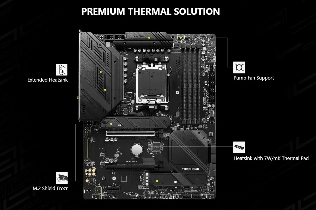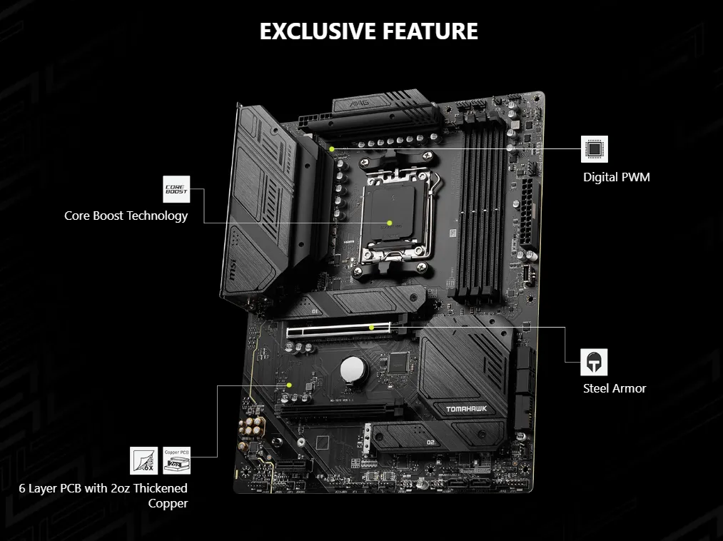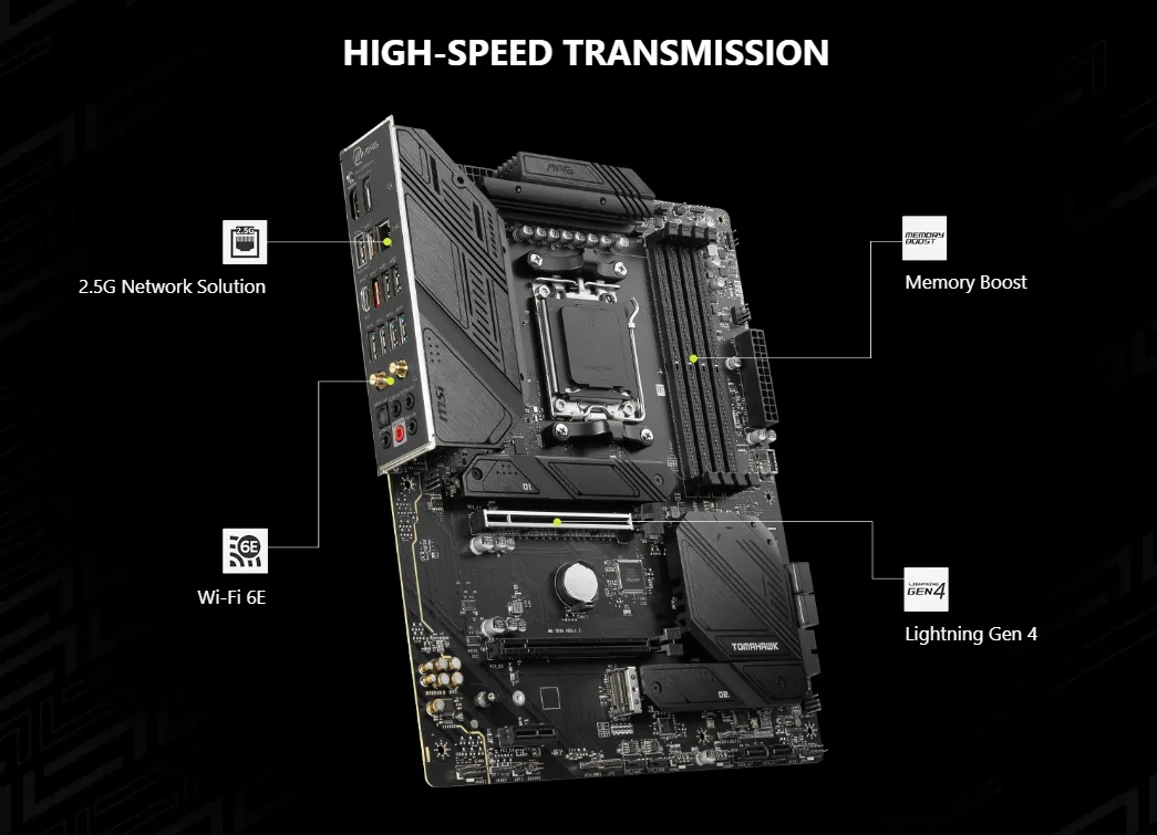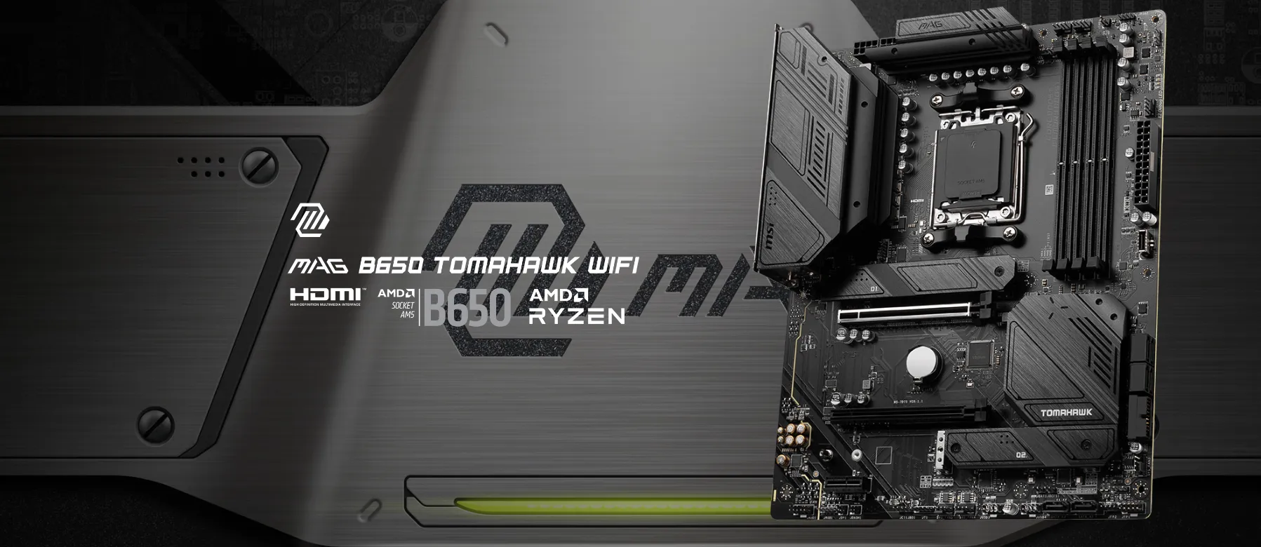 MSI MAG B650 Tomahawk WiFi Gaming Motherboard (AMD Ryzen 9000/8000/7000 Series Processors, AM5, DDR5, PCIe 4.0, M.2, SATA 6Gb/s, USB 3.2 Gen 2, HDMI/DP, Wi-Fi 6E, Bluetooth 5.3, 2.5Gbps LAN, ATX)